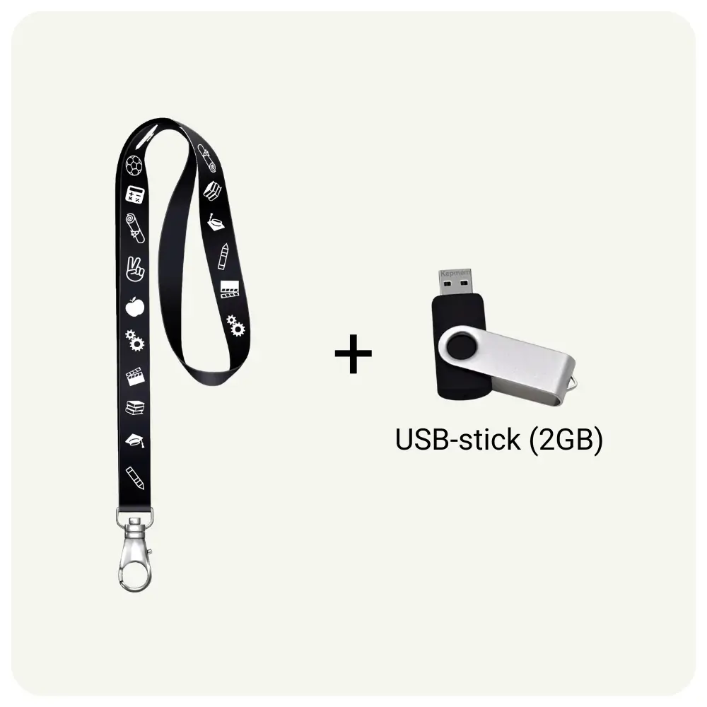 Stoere zwarte keycord met school-symbolen incl. USB-stick (2GB). Let op: Opslag ligt tussen de 1,5 en 2 GB (afhankelijk van hoe je de USB comprimeert).