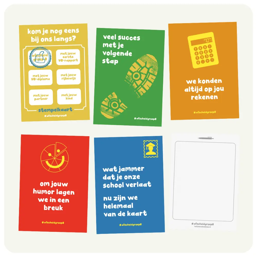 Een set van 5 verschillende kleurrijke wenskaarten, waarvan de achterkant beschrijfbaar is, om de leerlingen van groep 8 na de afscheidsavond een persoonlijke bericht van de leerkracht mee te geven.